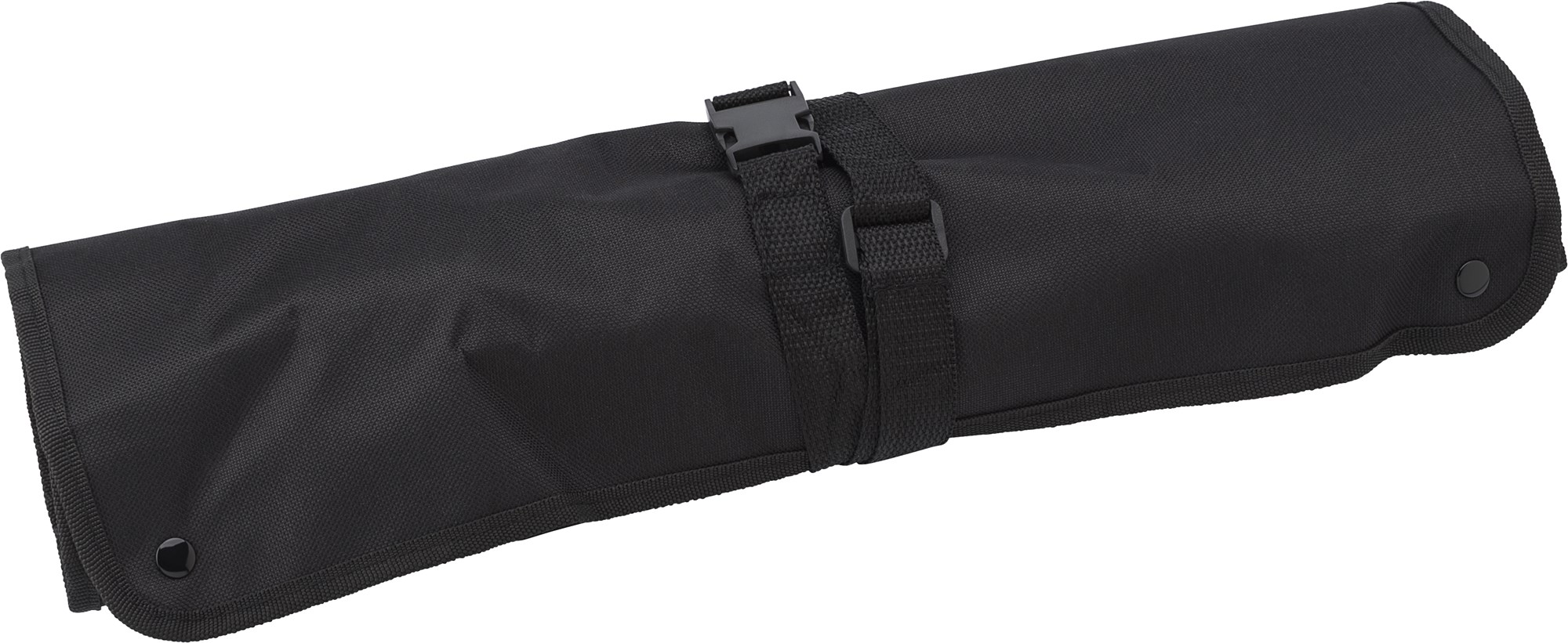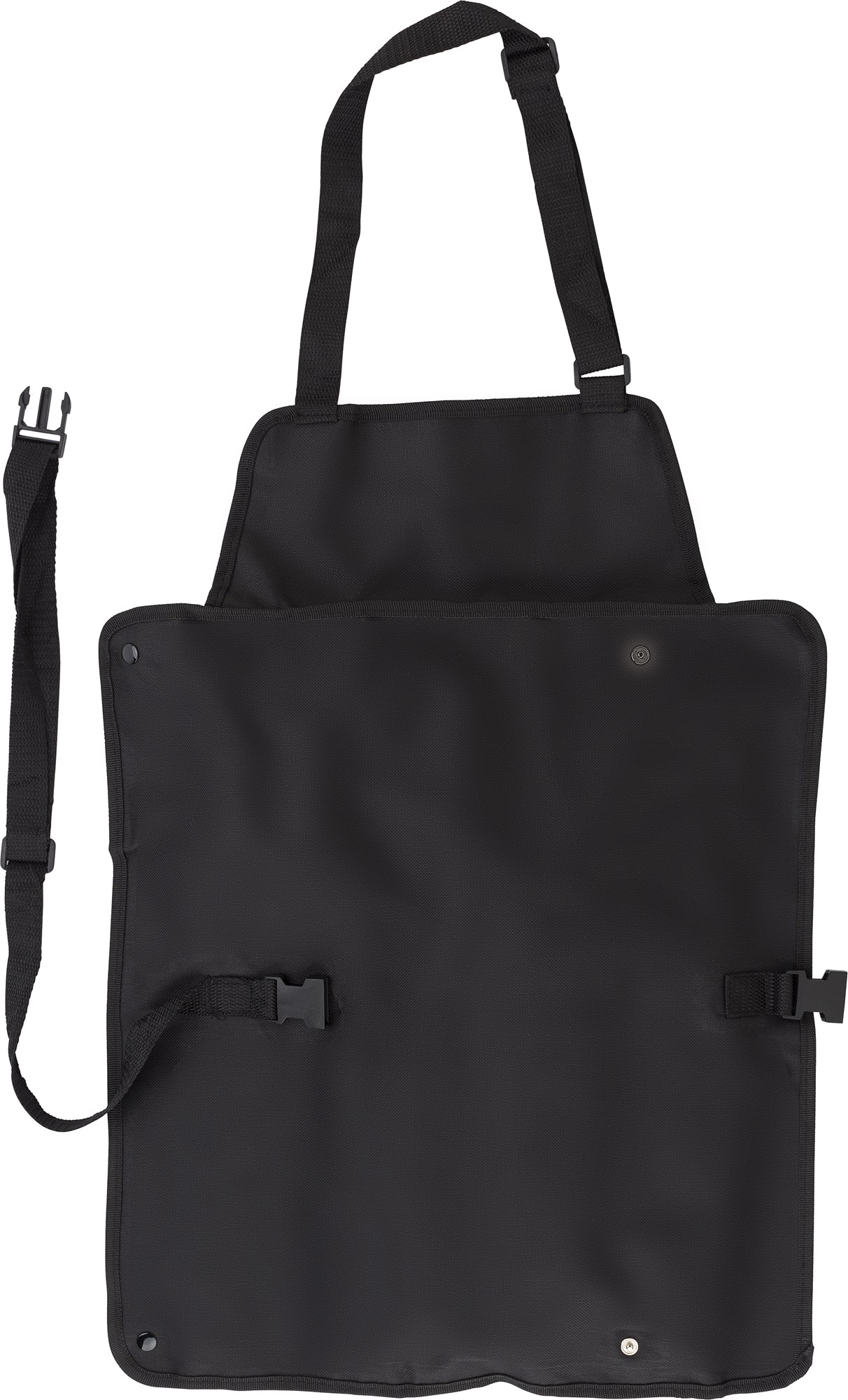 Six-piece stainless steel barbecue set, with a black nylon apron (600D) with carving fork, spatula, tongs, and salt and pepper set.